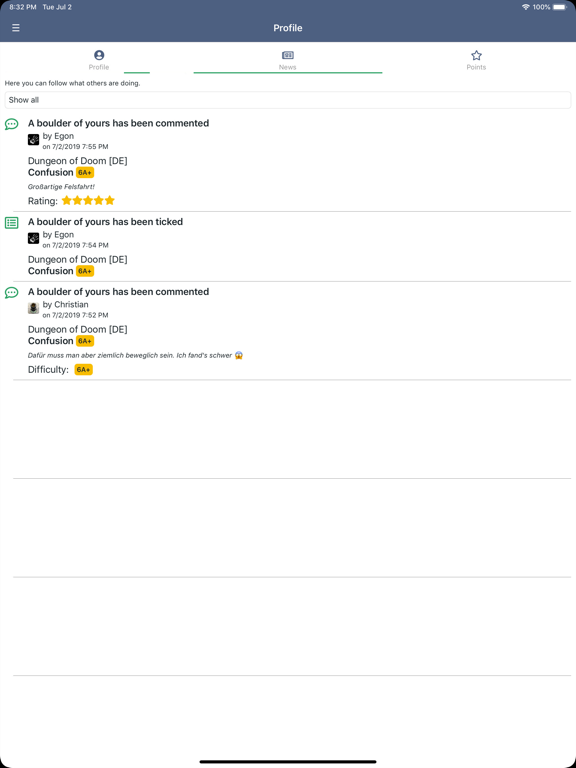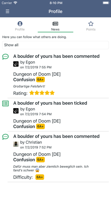 - If you connect with other climbers by subscribing to them, you can see in your news what they did. In addition, you will see in your personal news e.g. if one of your boulders has been climbed or commented on.
