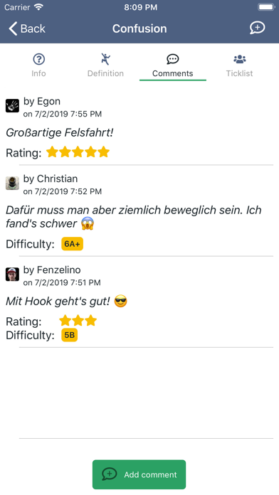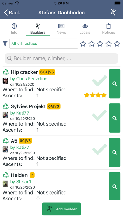 - For each location you can find all the boulders already created there. You can comment and rate them, save them under your favorites and add them as "sent" to your personal ticklist.