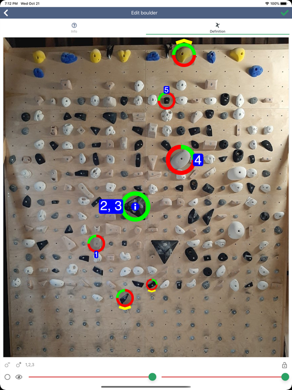 - How detailed you define your boulder is up to you. Start and end holds are mandatory. If necessary, you can also specify each hold more precisely. For example, if a hold only with the left hand may be used or it is only a hand hold, but not a foot hold. As an option you can even add numbers to each marker to define fixed movement sequences or cirqular boulders. If that's not enough, you can add a note to each marker. Of course, you can also move and delete existing markers. At least as long as no one else has climbed your boulder ;)