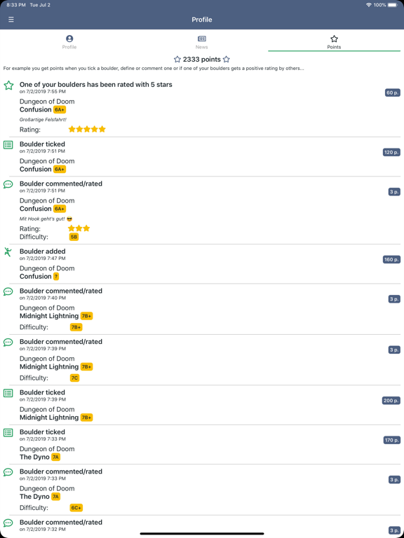 - You get points for all your actions. For example, if you have climbed a boulder and added it to your ticklist, but also if one of your boulders has been rated well by someone else.