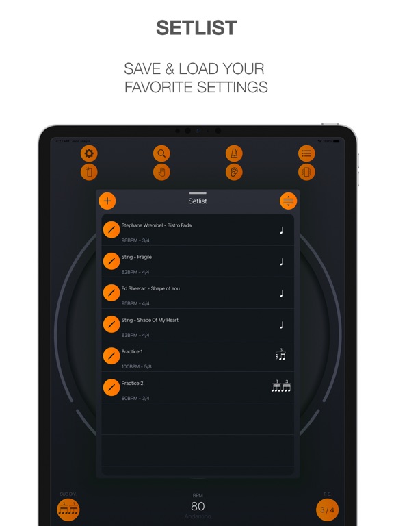 Metronome Programmable setlist – save and load your favorite settings ( 1 setlist available in FREE version ):