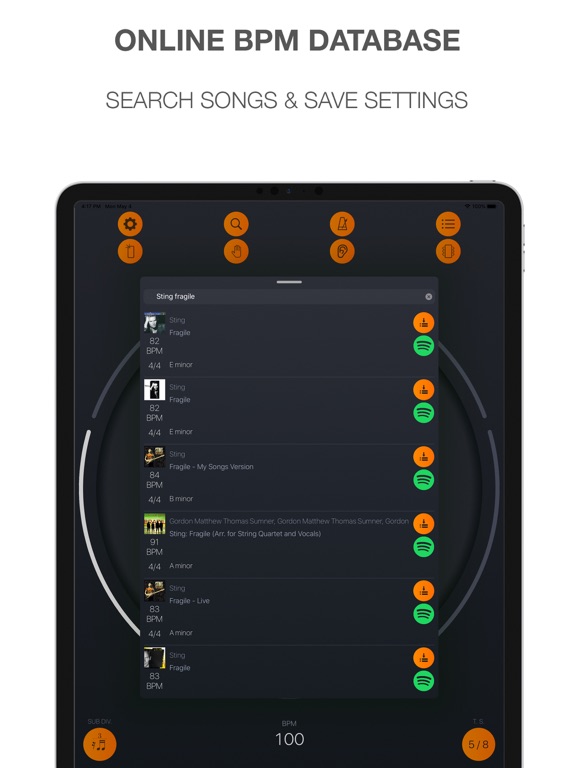 - Online BPM database: search songs & save settings to your setlist, listen on Spotify® ( If Spotify App is installed on your device, 30 second preview available if the Spotify App is not installed )