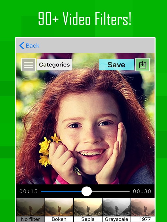 Our movie editor is very simple to use, just apply real-time filter and watch the result. Then save and publish it.