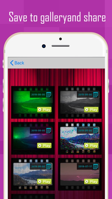 Shoot colorful videos and play with colors! Apply vintage retro camera, grayscale, vhs cam, glitch, chromatic or cartoonize and play with settings.