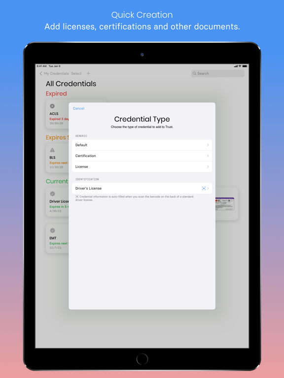 * Easily upload & store all your professional credentials: from licenses, to certifications, and more.