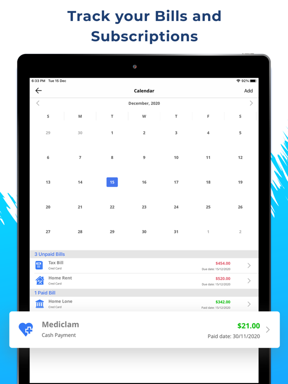 * View all upcoming, paid and overdue bills in Bills Dashboard