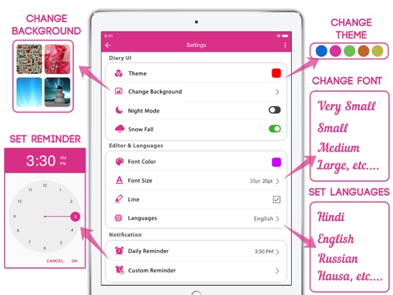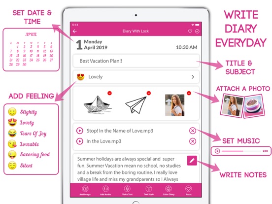 Secret Diary With Lock for all of your secrets, feelings, thoughts, and memories will be carefully locked and password protected so relax and make daily notes with a date using the best notebook journal with a lock on your smartphone or tablet. Choose between various different wallpapers, stylish writing fonts, and themes and make a personalized diary. All your secrets, your dreams, and your memories can be organized and managed in these free apps.
