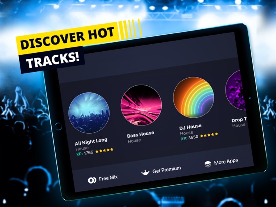 Once you've chosen your first track, it's time to get behind the decks and start tapping to the beat. Playing Tap & Mix is both exhilarating and straightforward! All you have to do is take hold of your decks and follow a dynamic cue system that will guide you through the mix. Each cue lets you know the moment you need to tap and how long you need to tap for to play along correctly. How well you play defines how much XP you earn, and the more accurately you tap to the beat, the more XP you'll receive! XP is used for purchasing new tracks and features, so you want to follow the cues and tap consecutively to create lines and get bonus combo XP! As you progress, you'll unlock new songs that will put your rhythm and mixing skills to the test as the challenge ramps up!