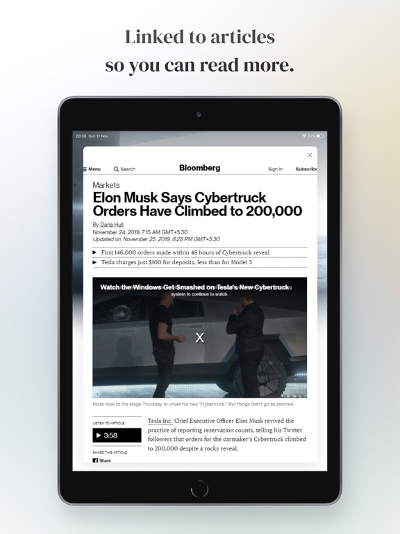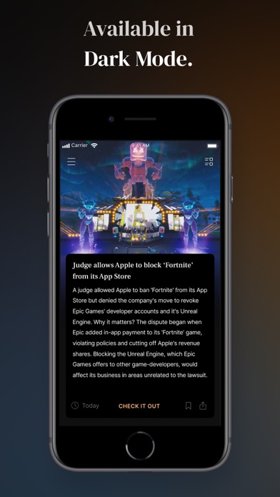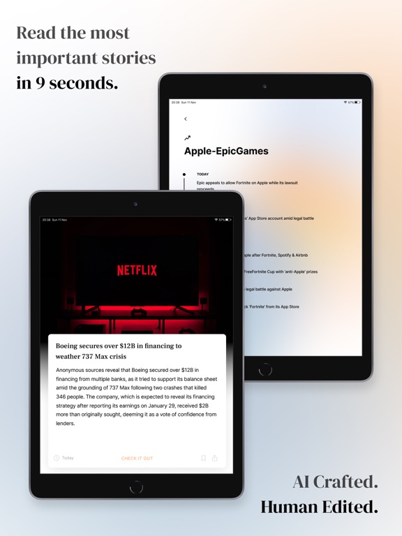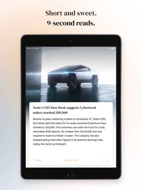 •Tinder-like UI: We have made reading the news as easy as swiping onTinder. Our unique “flashcard” format fits a news story into one screen allowing users to read the story in 9 seconds and scroll through at least 5 stories in under a minute.