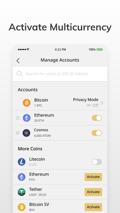 The app allows you to activate use of multiple cryptocurrencies on your Ballet product, allowing you to deposit, store, and send more than 50 kinds of cryptocurrencies. Please note: some cryptocurrency activations may require an additional fee.