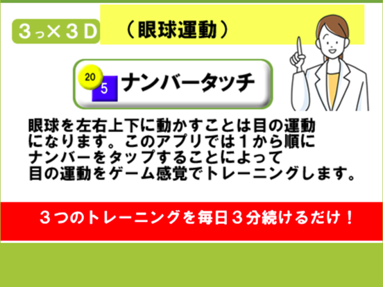 毎日継続してご利用下さい。3つのトレーニングの中から選んで挑戦して下さい。(3つとも挑戦してもOKです)1回のトレーニングは3分程度が目安です。