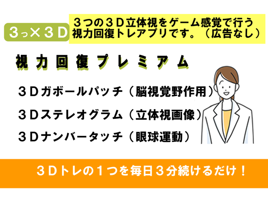 見るだけで視力回復トレーニング!3分で出来る目の筋トレ&脳トレアプリ!3種類の3D立体視をゲーム感覚で行う視力回復トレーニングアプリ、3×3D視力回復トレーニングのプレミアム版です。こちらのアプリはバナー広告が表示されないので心地よく使うことができます。