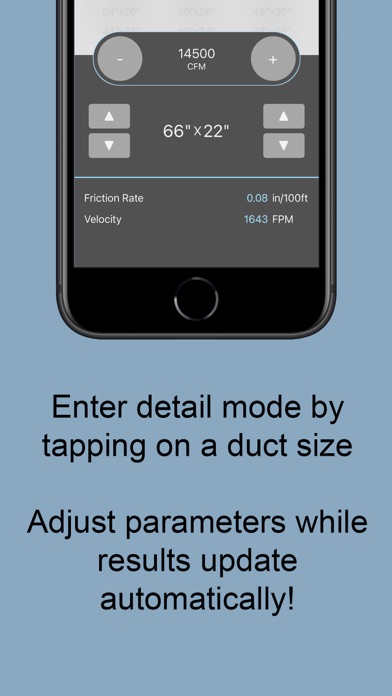 Get a range of suitable duct sizes by inputting either the maximum friction rate or maximum velocity. Duct sizing for both rectangular and circular ducts. Tap on the values for velocity or friction to switch between calculation methods.