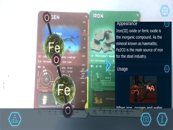 . AR (Augmented Reality): Learners use this feature to scan cards and explore about the elements and compounds. Learners can study about elements' occurrence, molecular structure, atomic structure. (Both sides of the cards are AR scannable.) Combination of two cards may give learners to either comparison of the two corresponding elements on the periodic table or a binary compound involving two relevant elements.