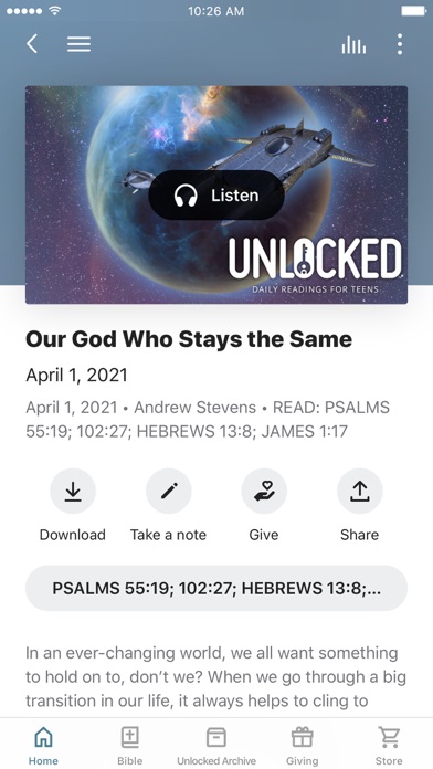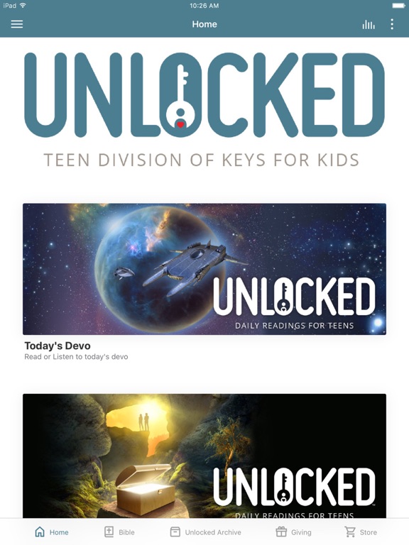 Unlocked is a quarterly devotional for teens featuring daily readings centered on God’s Word. You can read or listen each day. Each day’s devotion—whether fiction, poetry, or essay—asks the question: How does Jesus and what He did affect what we’re talking about? With daily readings designed to encourage discussion and a deeper walk with Christ, teens are encouraged both to engage with the Bible and to write and submit their own devotional pieces to Unlocked. With this app you can: