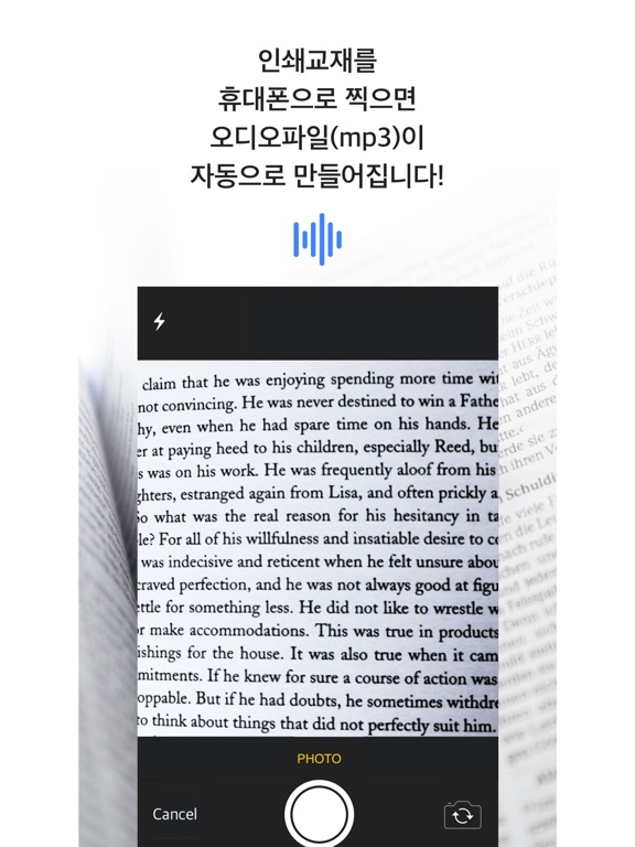 바로 앞에 교재를 펼쳐놓고 사진으로 찍으세요. 즉각적으로 자동 텍스트로 전환됩니다.