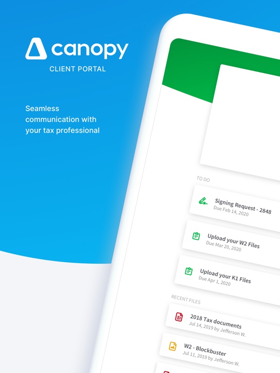 Canopy has simplified how you share files and exchange information with your accountant. This app is designed for you, the client. You have likely been invited to the Canopy Client Portal by your tax professional, including access to the Client Portal via your preferred mobile device.
