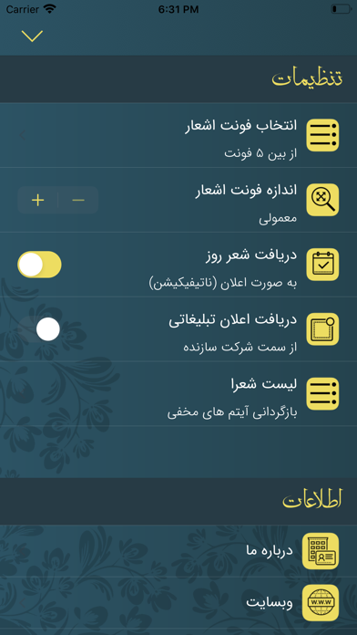 با سوایپ (کشیدن انگشت خود به چپ یا راست) بر روی نام هر شاعر میتوانید آنرا از لیست شعراء مخفی کنید و یا در بخش تنظیمات (سه خط بالا در سمت چپ صفحه نمایش) می توانید نام شاعر مخفی شده از حالت مخفی خارج نمایید.