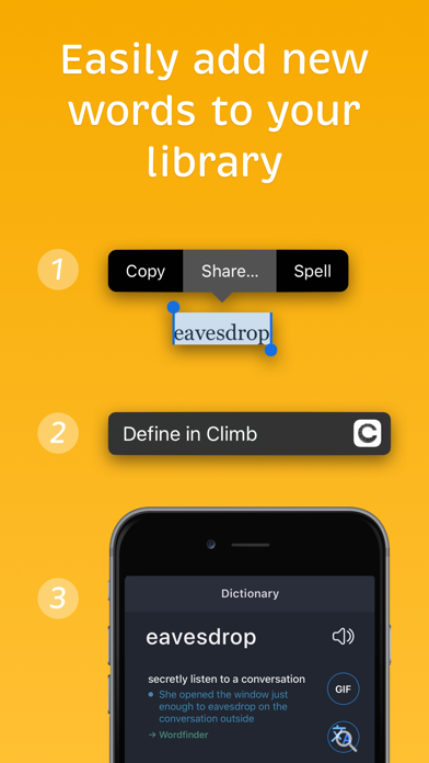 2. Simply select any word, then tap ""Share"" and choose ""Define in Climb"" to get its definition and add it to your practice list.