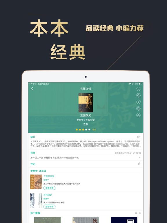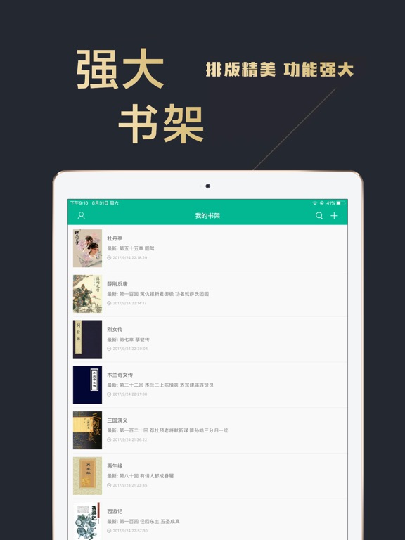 书架:列表、九宫格、自动分组、自定义置顶。 书籍:男女、排行榜、精选推荐、好书看不完。 我的:踪迹、换皮肤、夜间模式、多设备阅读。 阅读:听书、切声音、翻页设置、十二种背景。