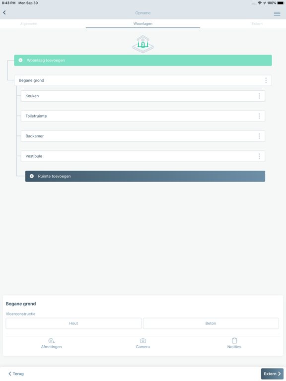 Iedere woning is uniek, maar met de Ruimte Explorer in de App is dat geen enkel probleem. Je voegt eenvoudig verdiepingen en ruimtes toe zodat je iedere unieke woning volledig kunt opnemen.