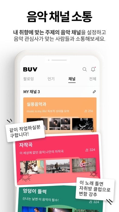 · 나의 음악 취향을 채널로 설정하고 나와 비슷한 취향의 사람들과 소통할 수 있어요.