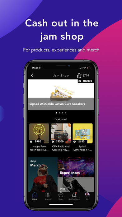 Redeem Jam points for unique products from popular brands, exclusive artist merchandise, and one of a kind experiences. Experiences depend on the artist and could include Listening Parties, Artist FaceTimes, Behind-The-Scenes, Video Game Sessions, and Digital Concerts.