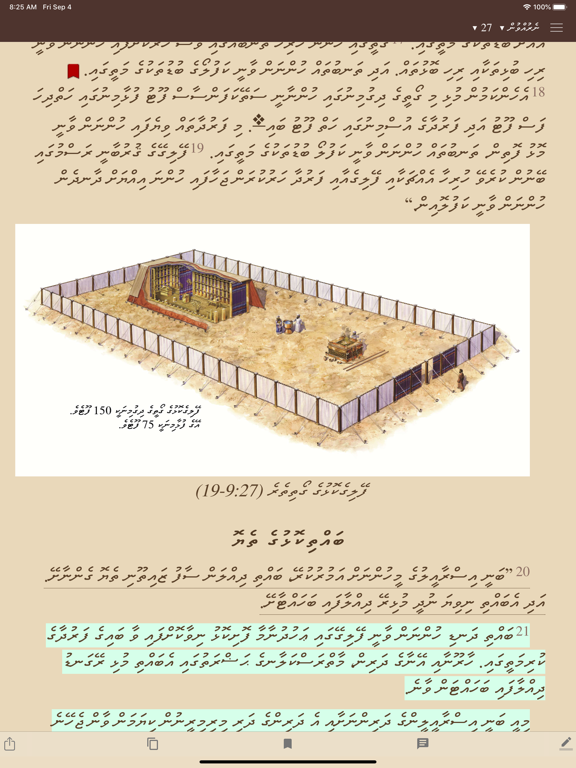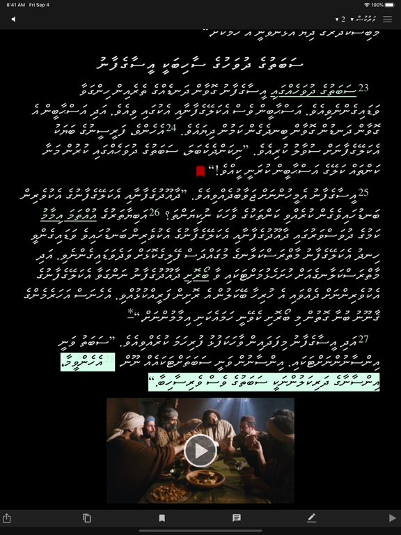 Users have the option to choose either English or Dhivehi as the interface language. The app features a right-to-left orientation that is consistent with Thaana. Audio narrations are available for several books, either by streaming or offline, and video portrayals are scattered through the books of Mark and Luke.