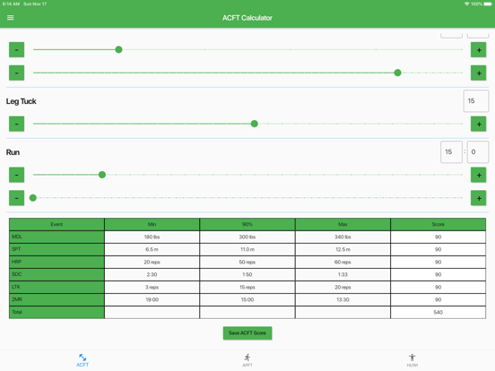 ACFT Calculator allows you to input your scores with a slider bar, increment/decrement buttons, or by typing in your raw values to calculate your event and overall score. The app will also let you know the raw values you need to get the minimum (based on your MOS Physical Category), maximum, or 90% score. The app's simple MOS lookup tool will let you know which physical category you fall into based on your MOS/AOC.