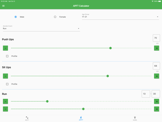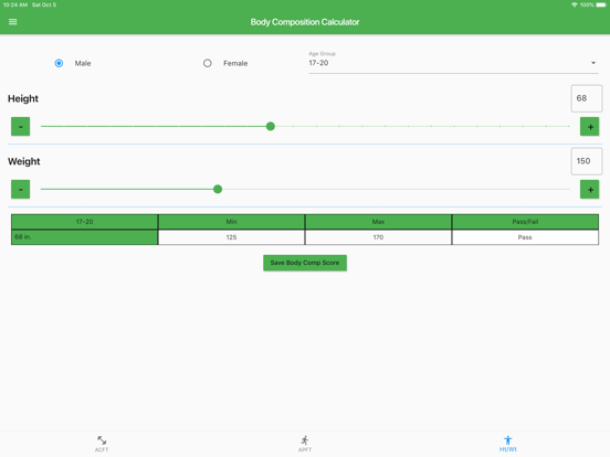 In addition to calculating the ACFT, the app also calculates your APFT since that is still the Army's official standard through FY20. The app also has a section to calculate Ht/Wt and BF%.