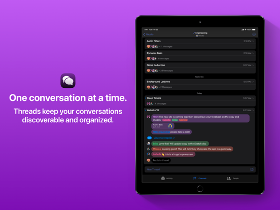 Threads keep your conversations discoverable and organized. When you need to stay focused on a topic, use Structured Channels to require each conversation to be its own thread up front.
