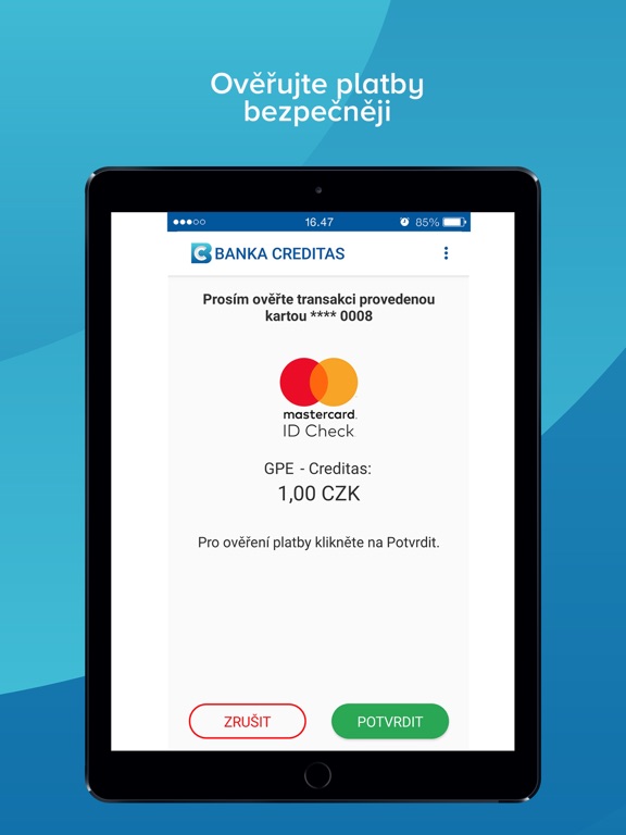 Pro potvrzení platby kartou na internetu vám přijde notifikace do vašeho zařízení. Zkontrolujete údaje o platbě (obchodníka, výši částky) a potvrdíte. Potvrzení probíhá dle vašeho nastavení, například pomocí biometrických údajů.