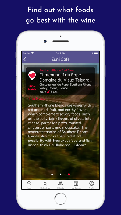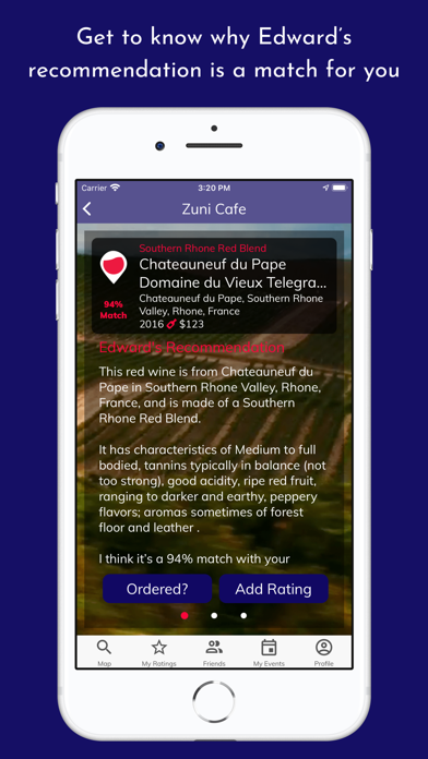 Not sure what wine to pick from a wine list? Let us introduce you to Edward, your new personal hand-held sommelier and guide to the world of wine. With a few simple questions, Edward creates your very own wine profile and right away begins offering wine recommendations from your favorite restaurants and retailers. Each personalized recommendation includes your match score and details about the wine region, the grape varietal and food pairings. Discover and select new wines. Rate your wines and keep track of the wines you like. As you rate wines, your profile gets richer and Edward’s recommendations get even better.