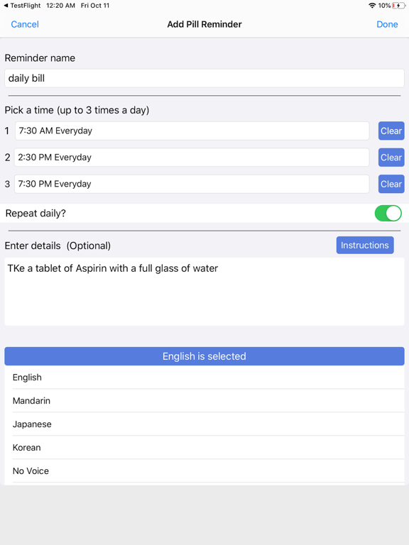 My Pill Time Reminder is a simple medication reminder. You can choose to play detailed medication information in 4 supported languages. It is suitable for everyone, especially for those who are more alert to voice cues.