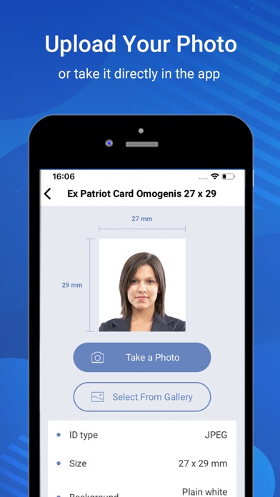 Passport & ID Photo Maker is an easy-to-use passport photo making app. Create pictures for passport, visa, ID cards, Green Card, DV Lottery, driving license and other documents right at home. A few touches - and your passport photo is ready and meets all the official requirements.