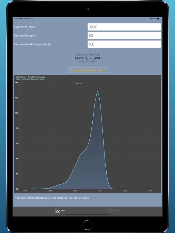 This app allows you to compare the battery capacity of your electric car with the battery capacity of other cars with the same configuration and mileage. In this way, you can determine if the battery capacity of your electric vehicle is better or worse than the majority of other cars with your milage and configuration.