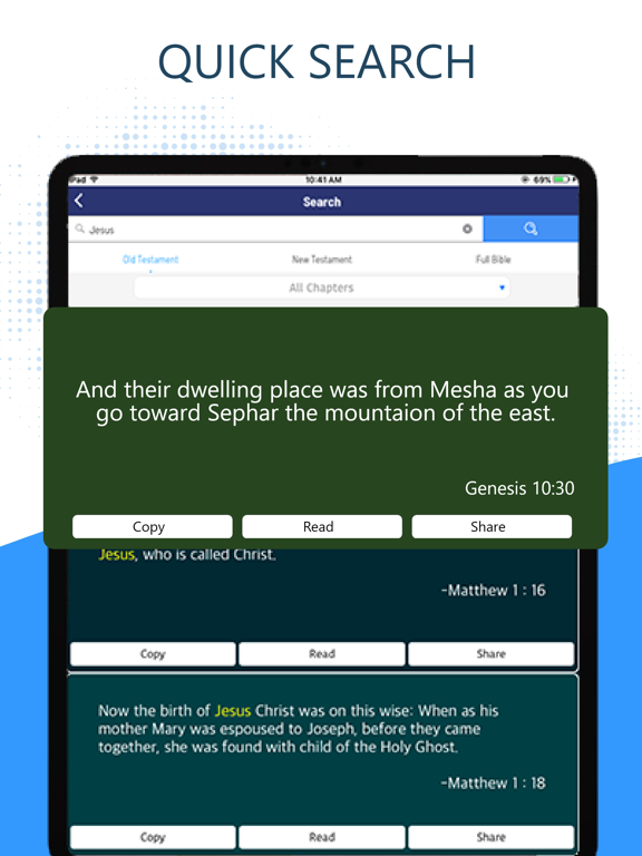 • Share verses with friends: The Holy Bible app serves to share your love for Jesus with friends across the world on social media via email, or SMS/text