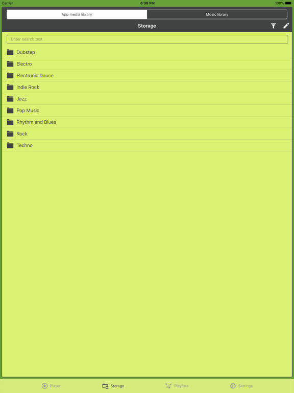 • create, save and manage playlists in m3u format. All playlists are available via iTunes File Sharing or Files iOS app. Playlist module allows you rearrange tracks, delete them right on the main screen.