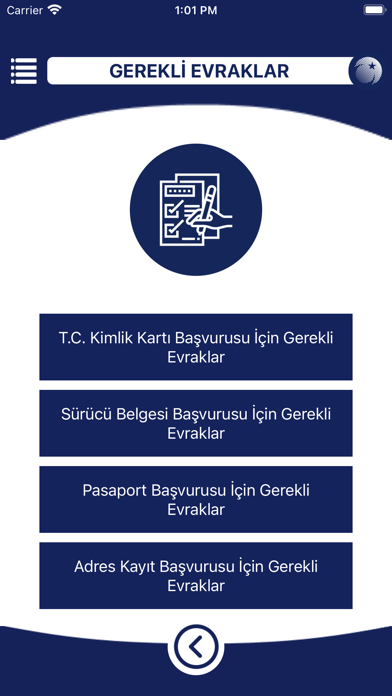 Nüfus ve Vatandaşlık İşleri Genel Müdürlüğü mobil uygulaması, - Kimlik no doğrulama - Kimlik no sorgulama - Yabancı kimlik no doğrulama - Yabancı kimlik no sorgulama - Talep oluşturma - Talep sorgulama - Randevu alma - Randevu sorgulama - Randevu iptali - Sunulan hizmetler için gerekli bilgilendirmeler - Anlaşmalı bankalar - Nüfus müdürlükleri adresleri gibi hizmetleri içerir.