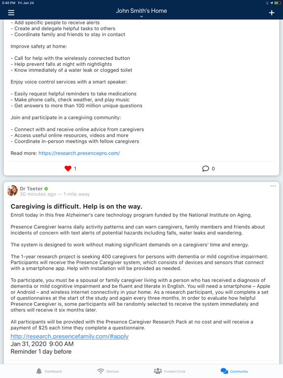 Answering yes to these questions will qualify you to participate in the research project and receive the Presence Caregiver Research Pack at absolutely no cost. Once qualified, you will be contacted immediately by a representative of the research team. Your system will be shipped to your home, and a customer service installation expert will schedule an appointment to guide you remotely through the setup of your system.