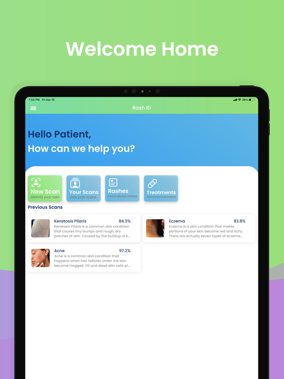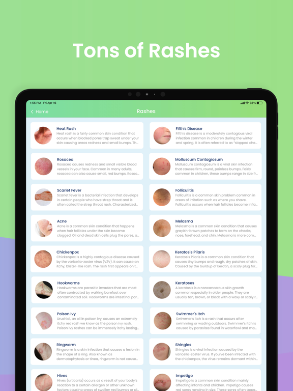 Using advanced AI, Rash ID analyzes a high detail scan right on your device quickly and securely identify your skin disease. Trained on a dermatology database containing thousands of images, Rash ID is built on reliable clinical data you can trust.