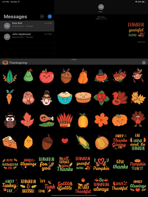 There is a wide variety of Happy Thanksgiving Stickers you can choose from this app. Peel and stick them over other conversation bubbles, images, photos, even on other stickers.