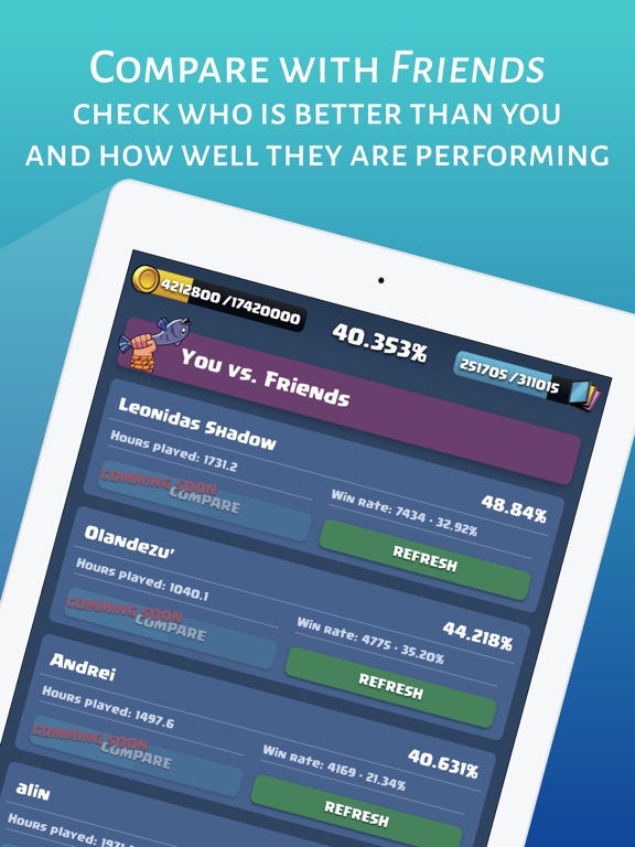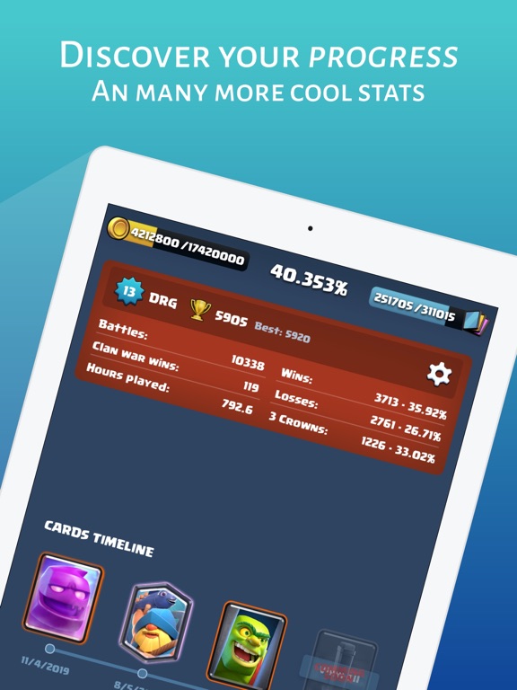 Get your progress, stats, clan activity manager, friends comparison, chest tracker, wallpapers, cards analysis and many more tools for Clash Royale all of them together in one single app. Please Note: This content is not affiliated with, endorsed, sponsored, or specifically approved by Supercell and Supercell is not responsible for it. For more information see Supercell's Fan Content Policy.