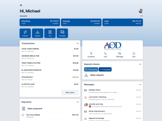 AOD Mobile is your personal financial advocate that gives you the ability to aggregate all of your financial accounts, including accounts from other banks and credit unions, into a single view. It’s fast, secure and makes life easier by empowering you with the tools you need to manage your finances.