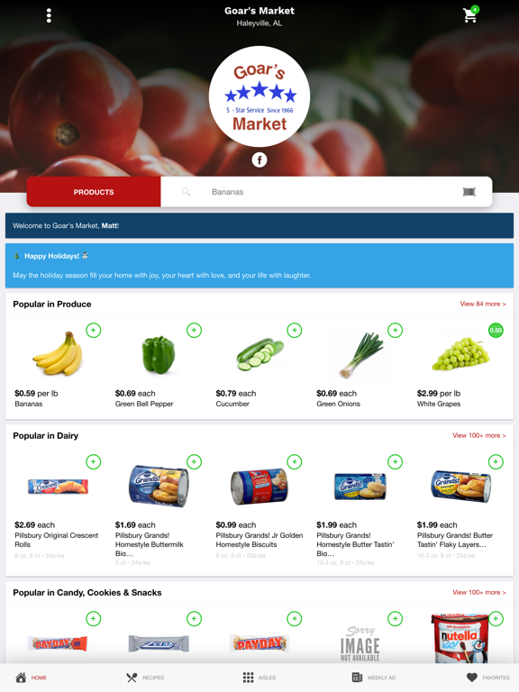 Order your groceries from Goar's Market on the go on your mobile device or from your iPad on your couch. Our award-winning grocery app makes grocery shopping a breeze with quick access to our weekly circular, an easy-to-use product search, detailed product details and labeling, tasty recipes and family meal planning tools. What could be better than that?