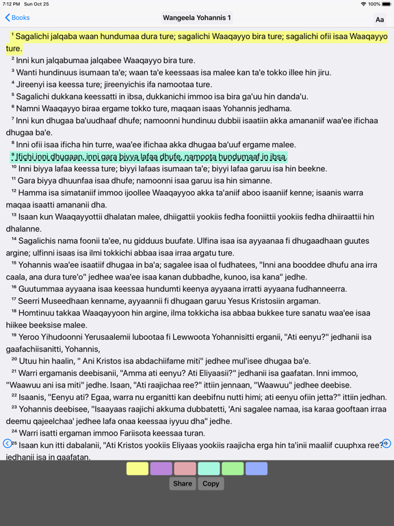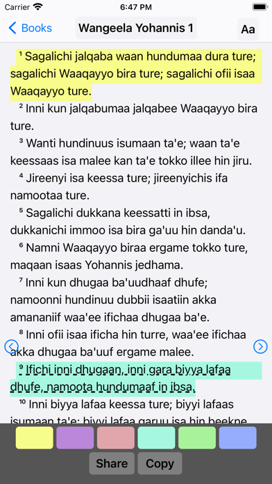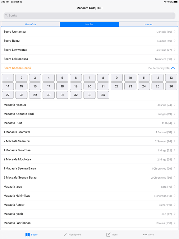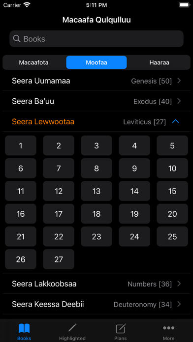 This offline (No Internet needed) Oromo Bible App lets you search for all the books or sort between the New & Old testaments for an organized selection. It will automatically save you the selected book & chapter as a 'plan' record. These plans can be edited to add more details to be used for future studies. This automatic plan creation was intended to supplement note takings during church sermons or bible studies.