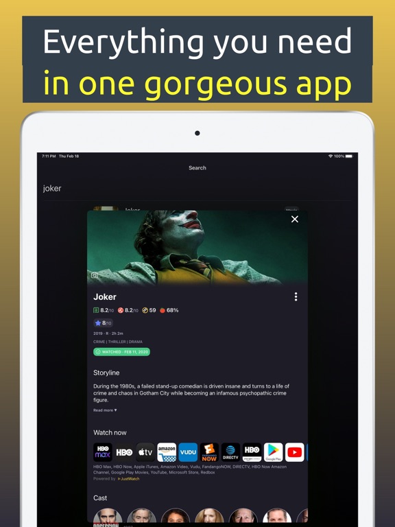 * Detailed information for every movie and tv show including: Meta Critics, Rotten Tomatoes, The Movie DB & Trakt scores, streaming providers in your country where available, HD trailers & images, cast & crew information, other users reviews, official premiere dates, links of interest, etc...