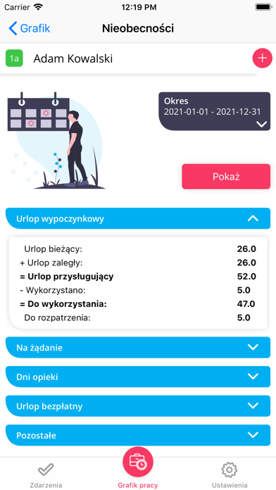 Wykorzystując ATMS Chrono, w łatwy sposób zarejestrujesz rozpoczęcie lub zakończenie pracy, sprawdzisz ile przysługuje Ci urlopu i ile godzin przepracowałeś w wybranym okresie. W ATMS Chrono szybko wypiszesz i prześlesz wniosek o urlop.