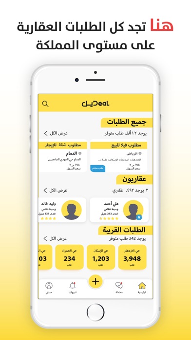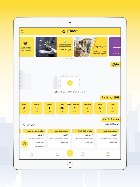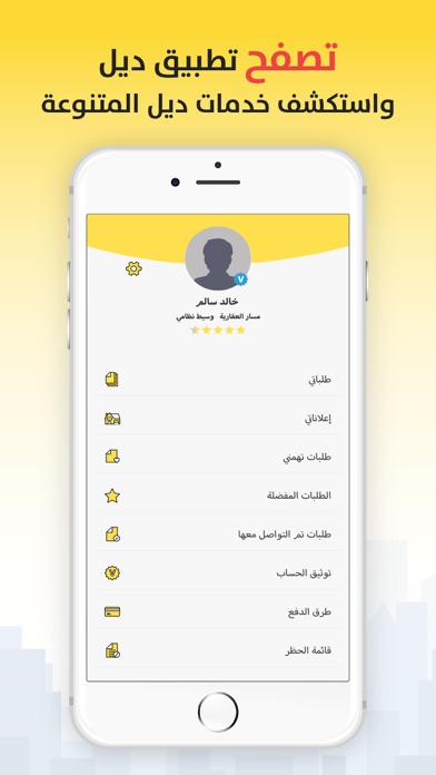 في تطبيق ديل لا تبحث عن العروض العقارية لكن اطلب عقارك بنفسك وين ما كنت في المملكة العربية السعودية، من خلال واجهة سهلة الاستخدام وواضحة التفاصيل. الآن آلاف الوسطاء العقاريين المهتمين بطلباتك ينتظرونك ومستعدين لتقديم عروض عقارية تناسبك حسب مواصفات طلباتك الخاصة عبر التواصل الفوري (المحادثةالمباشرة داخل التطبيق أو الاتصال الهاتفي أو الواتساب).