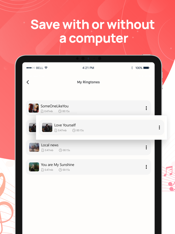 Ringtone Maker is the easiest app to create custom ringtones! Just choose your beloved iPod song, swipe the audio wave to select the perfect clip, and then your ringtone is ready! Incredibly easy and fast!